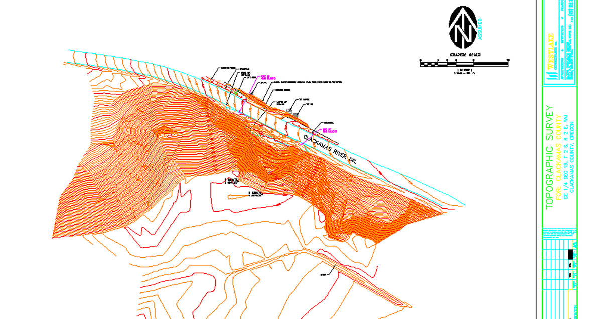 3D laser scanning answered the challenge of capturing data for a landslide on Clackamas River Drive in Clackamas County, Oregon. 3D scanning captures coordinate data for every visible surface in challenging and dangerous environments. The County had cleared material from the road surface, but needed survey data for remediation design. Ground surveying was impractical because of the unstable and dangerous slope extending approximately 300’ along the roadway to a height of nearly 400‘. The narrow roadway is located directly above the Clackamas River which further limited options for setting up survey equipment. The scan data were overlaid on a traditional topographic map to provide enough detail for Clackamas County geotechnical engineers to create a remediation plan.