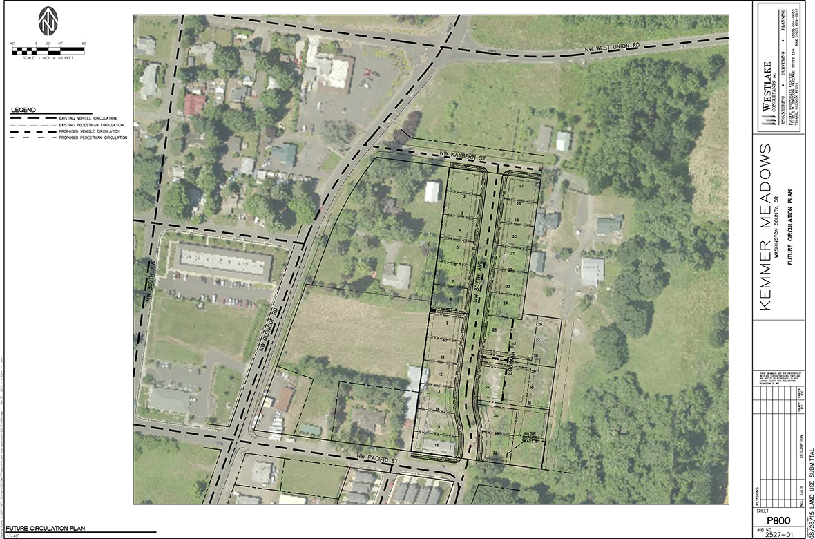 Westlake provided land use planning, civil engineering, and surveying services for a long-term Client in support of this two-phase plat in North Plains, Oregon. The first part of the project began with a Comprehensive Plan Zone Change and included 27 single-family residential lots. Site grading design included considerations to ensure compatibility with adjacent future commercial development, and included a retaining wall along the entire western edge of the site.